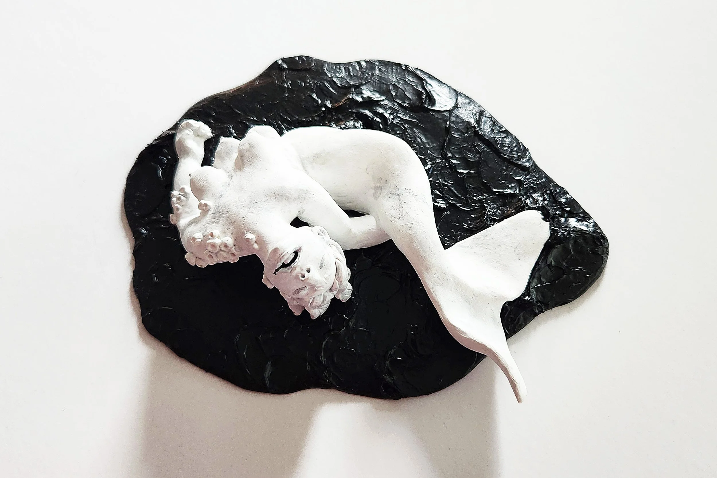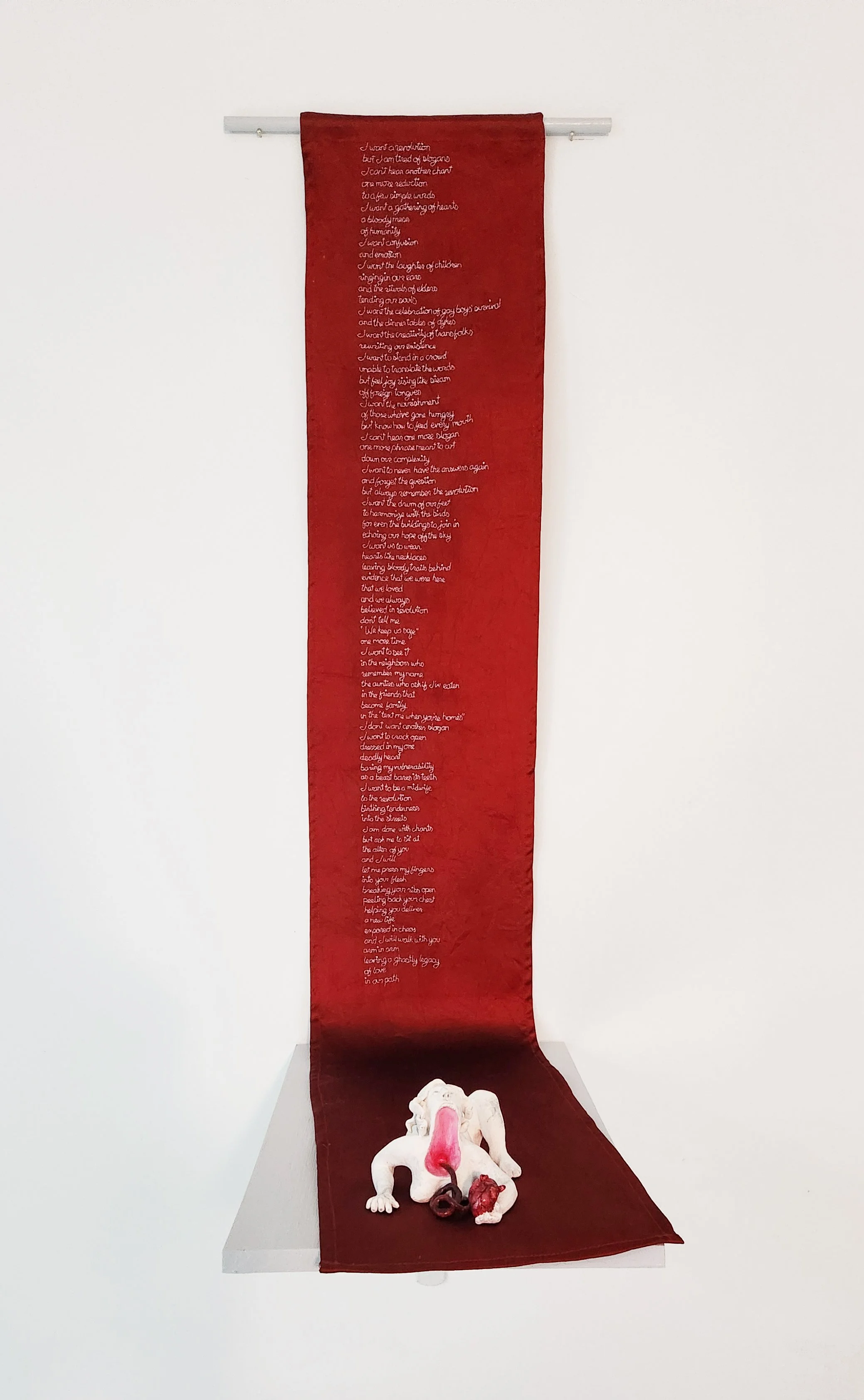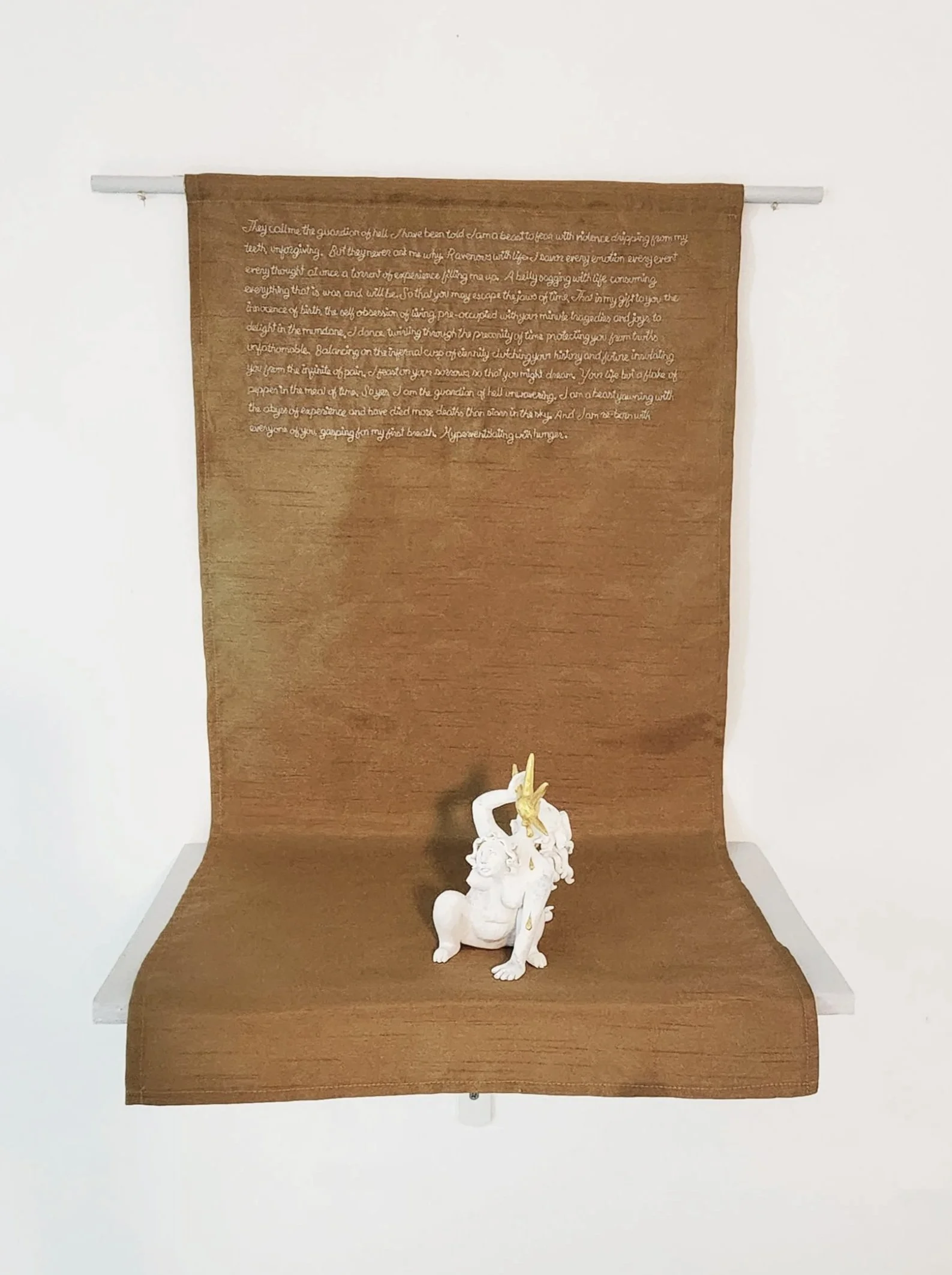 The erotics of eternal torment, 2025, 12"x 39"x 15", Polymer clay, acrylic paint, fabric and hand embroidery