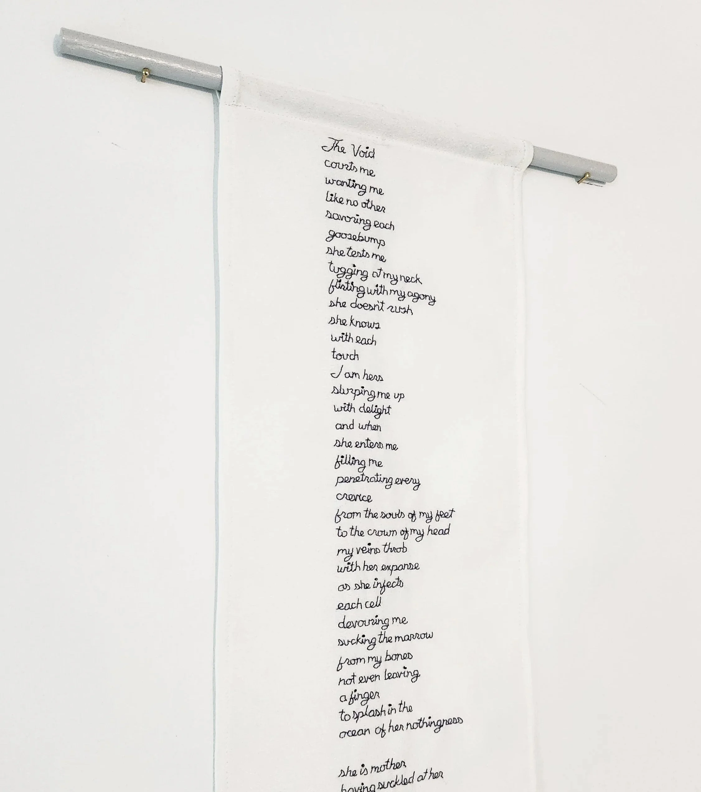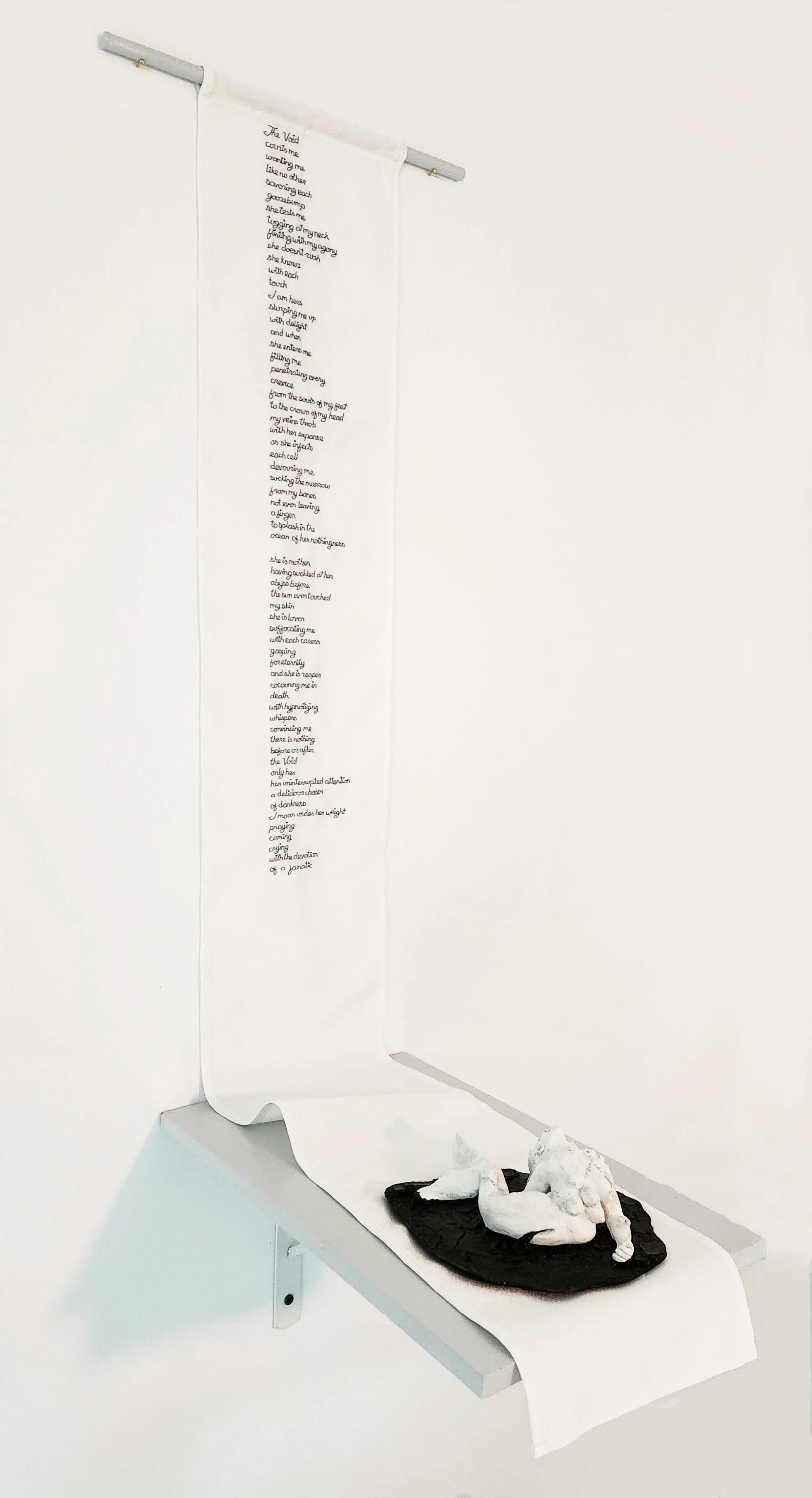Colorful elements break through the marble-like whiteness of these miniature monuments, suggesting a dialogue between freedom and constraint. The embroidered poems invite a deeper relationship with this re-written mythology, in which these sisters are weaving fates not only for others, but for themselves.