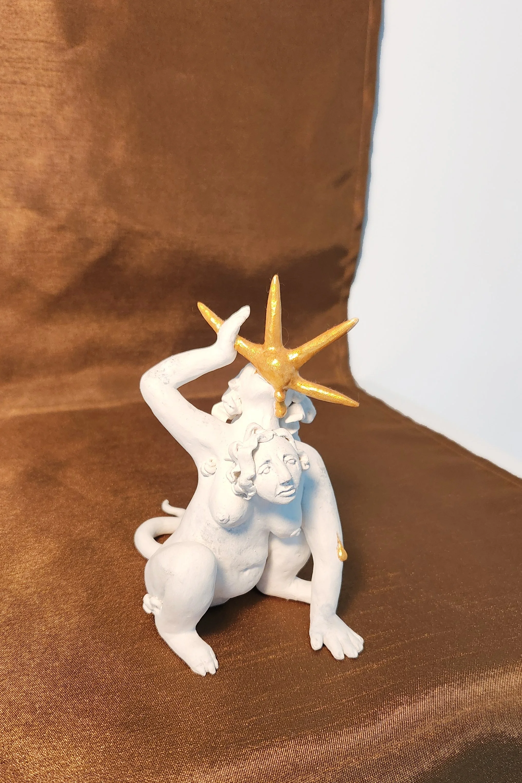 “Sisters of Fate” is a series of miniature figurines accompanied by original hand-embroidered poems. These monstrous and delicate figures re-interpret the tale of the Sisters of Fate of Greek mythology. The three sisters of the original myth represent the past, present, and future and together weave the fates of all humanity. The figures here use the materiality of their bodies to craft eternal cycles of life. Each claims a monumental fate that is sensual, dark, and rooted in the power of the feminine.